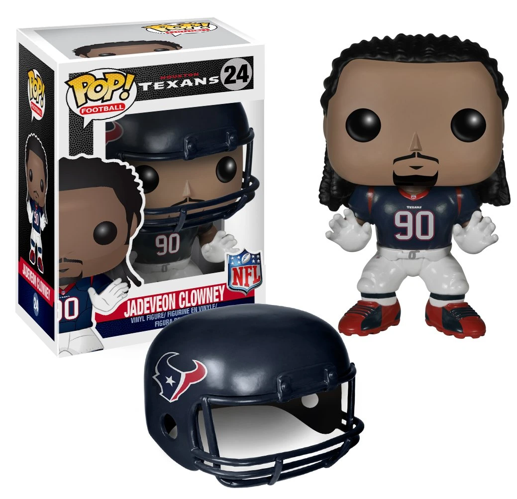 Houston Texans linebacker Jada eon Clowney stands 3 3/4-Inch tall in Pop! Vinyl Format and comes packaged in a window display box. Well known for his helmet-popping tackle at the Big House, Jada eon Clowney sports his goatee, mustache, home Texans uniform and comes with a removable Texans helmet!