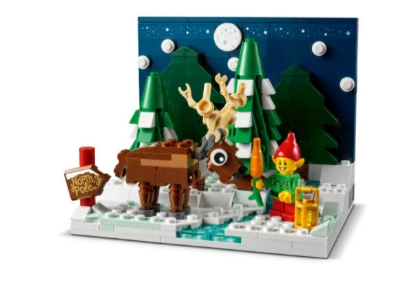 - LEGO® Santa’s Front Yard (40484) includes an elf minifigure, reindeer figure and an icy moonlit setting with a stream, snow-covered trees and North Pole sign, plus a hand lantern and carrot element.