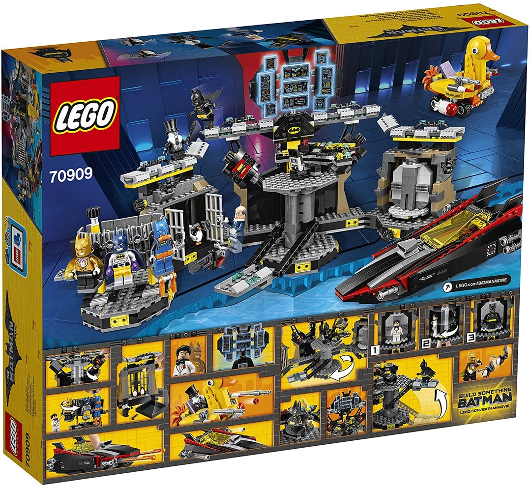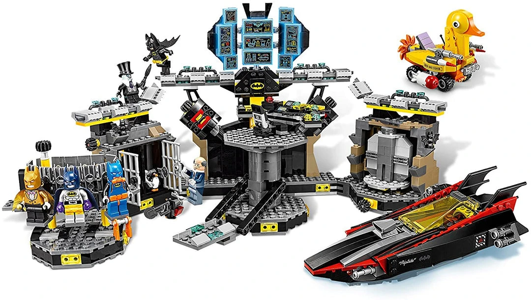 Defend against The Penguin’s Duckmobile invasion of the Batcave in THE LEGO® BATMAN MOVIE: Batcave Break-in set. The highly detailed Batcave features a rotating transformation chamber for Bruce Wayne™ to ‘transform’ into Batman™, rotating Batcomputer control center with multiscreen elements and elevating platform function, and a prison with an exploding escape wall function. The Batcave also has a rotating wardrobe with alternative Scu-Batsuit, Raging Batsuit or the Bat-Pack Batsuit minifigure bodies for Batman. Dial up the conflict by using the Batboat’s spring-loaded missiles against the Duckmobile’s dual stud shooters and flick missiles. Includes four minifigures plus two Hench-Penguin figures.