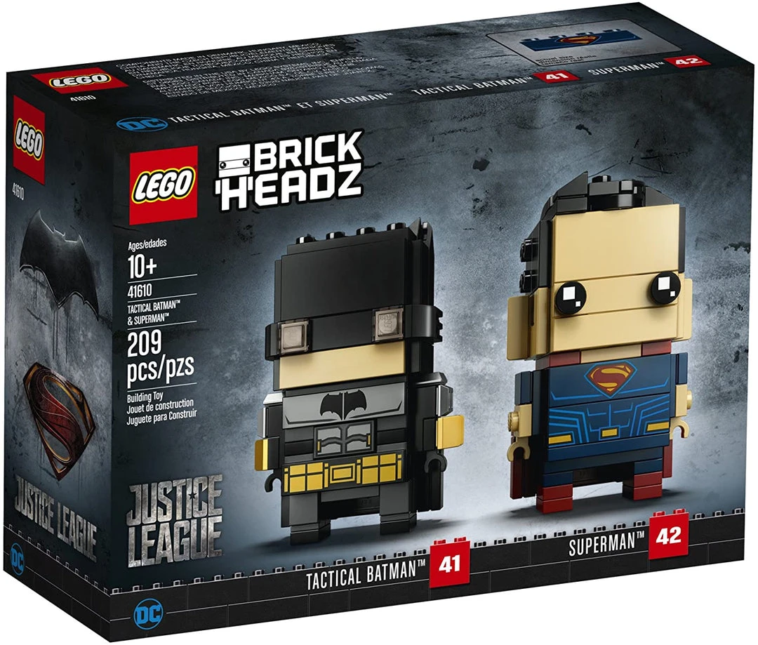 - Buildable LEGO® BrickHeadz™ construction characters featuring Tactical Batman™ and Superman™ have BrickHeadz eyes and authentic details from the blockbuster Justice League™ movie, including iconic Super Hero costumes.