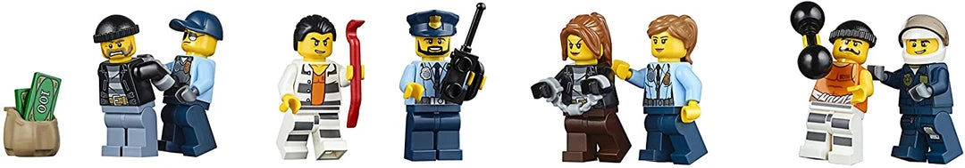 - Includes 8 minifigures: a male police officer, female police officer, police chief, police pilot, three male crooks and a female crook, plus a shark