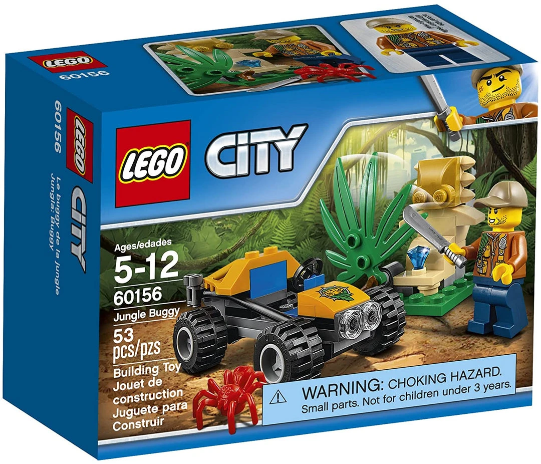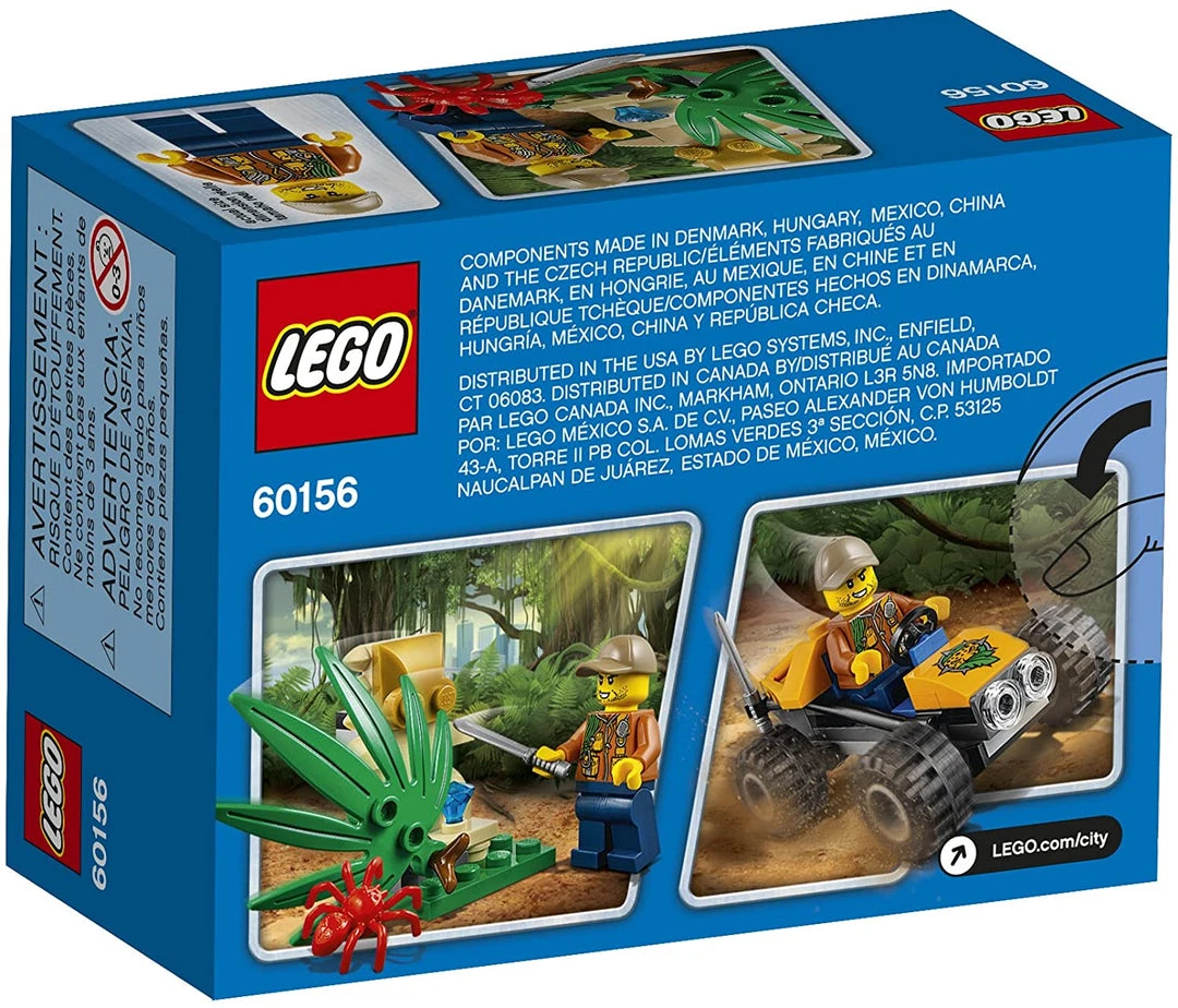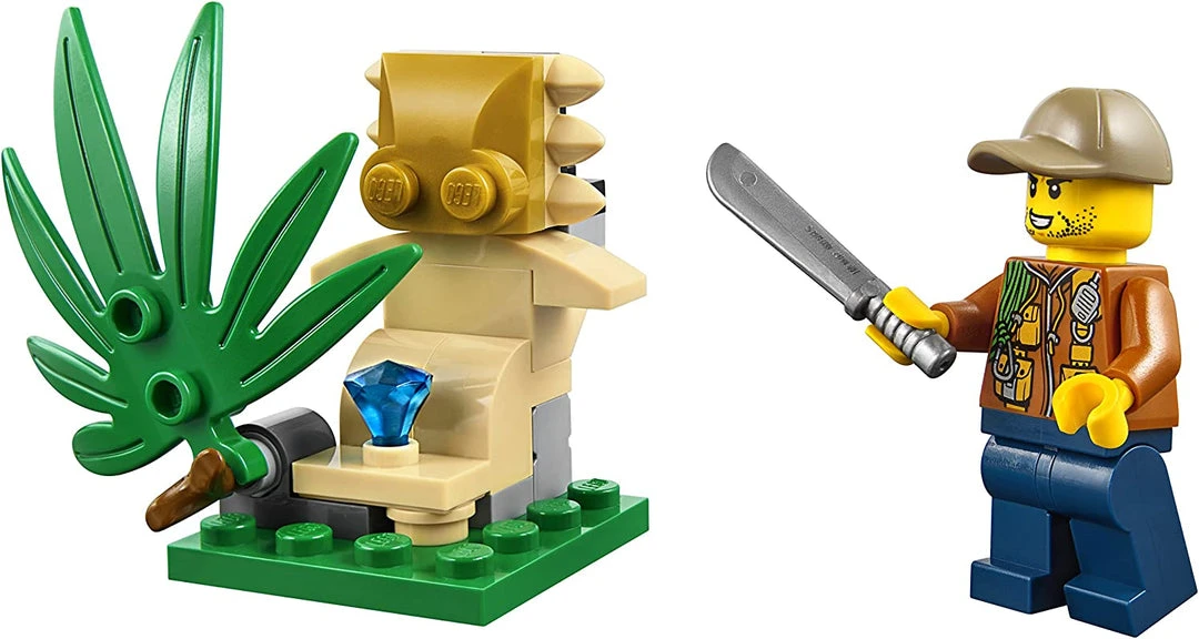 Go exploring in the wilds of the LEGO® City jungle with the Jungle Buggy featuring a minifigure cockpit and space in the back for machete and binoculars elements, plus a buildable statue with hidden diamond element, moving leaf and a red spider figure. Includes a minifigure.