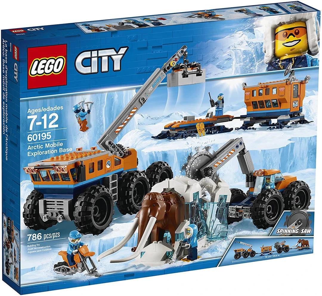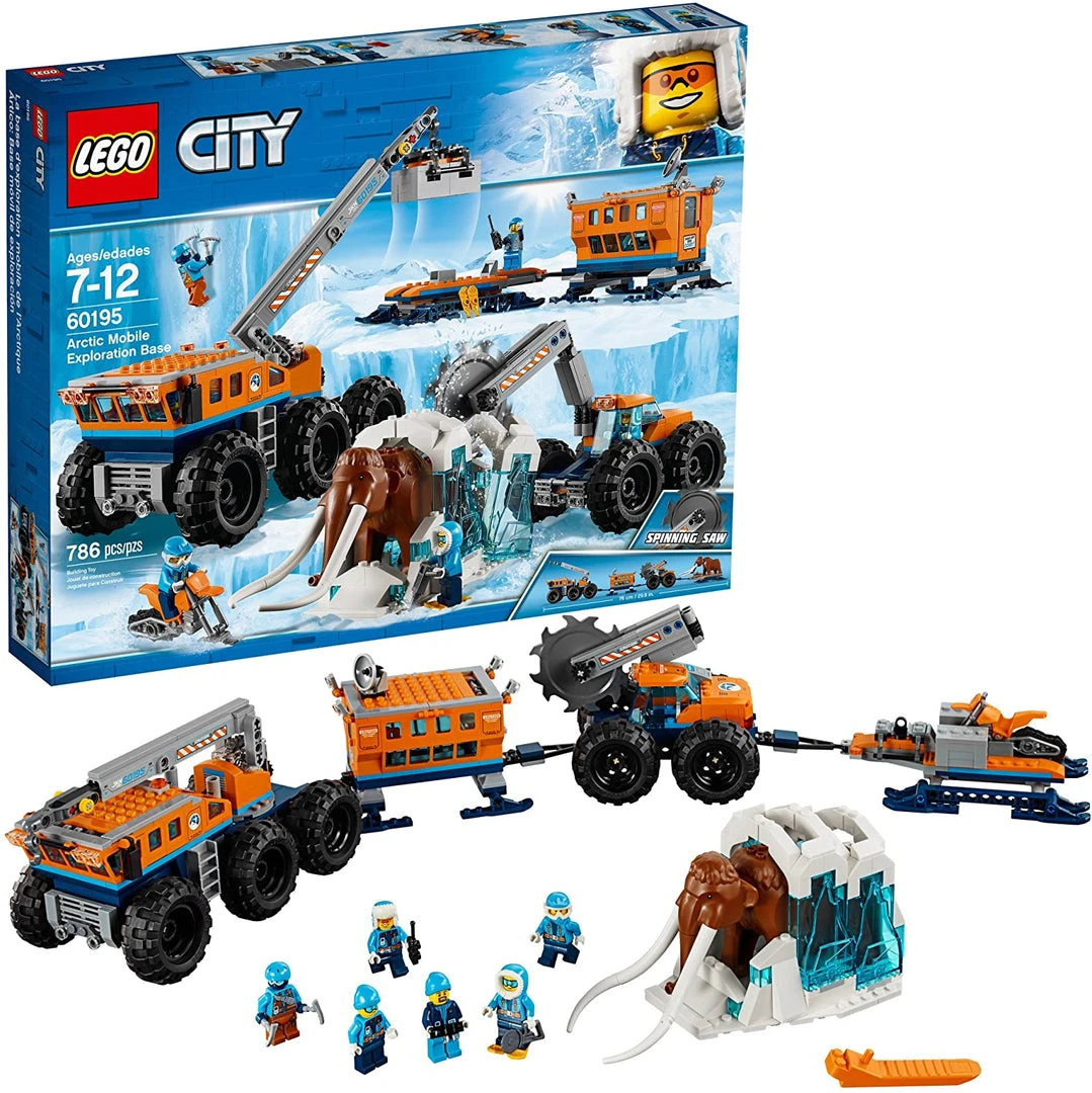 Investigate awesome finds on the go with the LEGO® City 60195 Arctic Mobile Exploration Base! This fun set features a crane with posable arm, hook, platform and a trailer, plus a mobile lab unit with radar dish and opening door. Also includes a mobile saw vehicle with posable arm and rotating blade, plus a snow bike and a large ice build to hold the mammoth. This Arctic Expedition set includes 6 LEGO explorer minifigures and a mammoth figure.