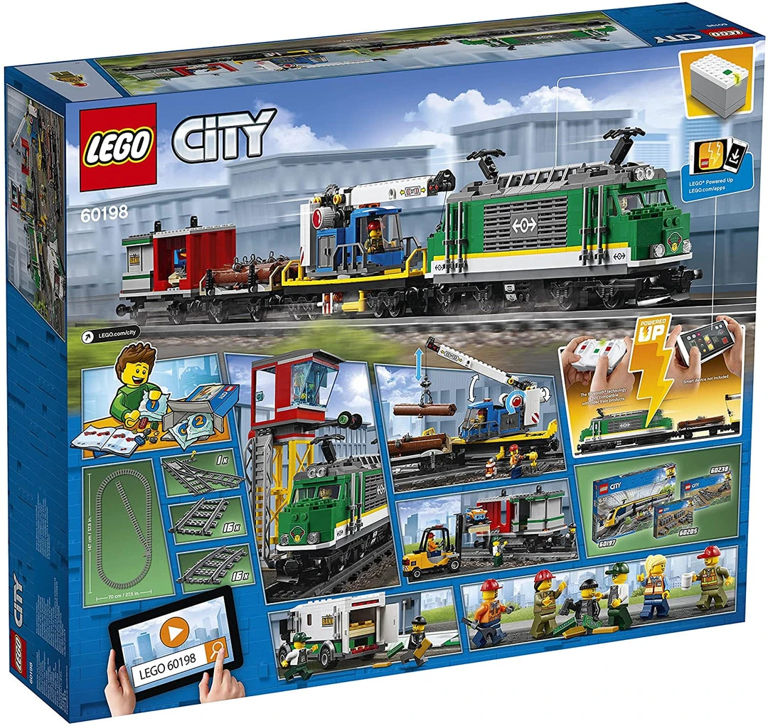 Load up the powerful LEGO® City 60198 Cargo Train and deliver the goods on time! This cool LEGO City set features a motorized engine with 10-speed Bluetooth remote control, accessible driver’s cabin, a crane wagon with rotating and extendable boom arm, container wagon with 2 containers, and a log wagon, plus an armored truck with opening doors, and a forklift with opening roll cage and lifting forks. This cool LEGO train set also includes a full circular track with 16 curved rails, 16 straight rails and a railroad switch with lever, plus a control center with ladder and 2 buildable pallets with money bills, gold bar elements, a snow scooter and 6 LEGO minifigures.