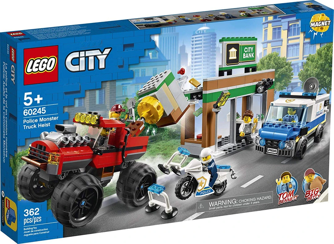 - This amazing building set for kids features a crooks’ monster truck with magnetic arm, a toy bank building with magnetic safe, a police surveillance van and motorbike, plus police hero Tom Bennett and crook Big Betty minifigures