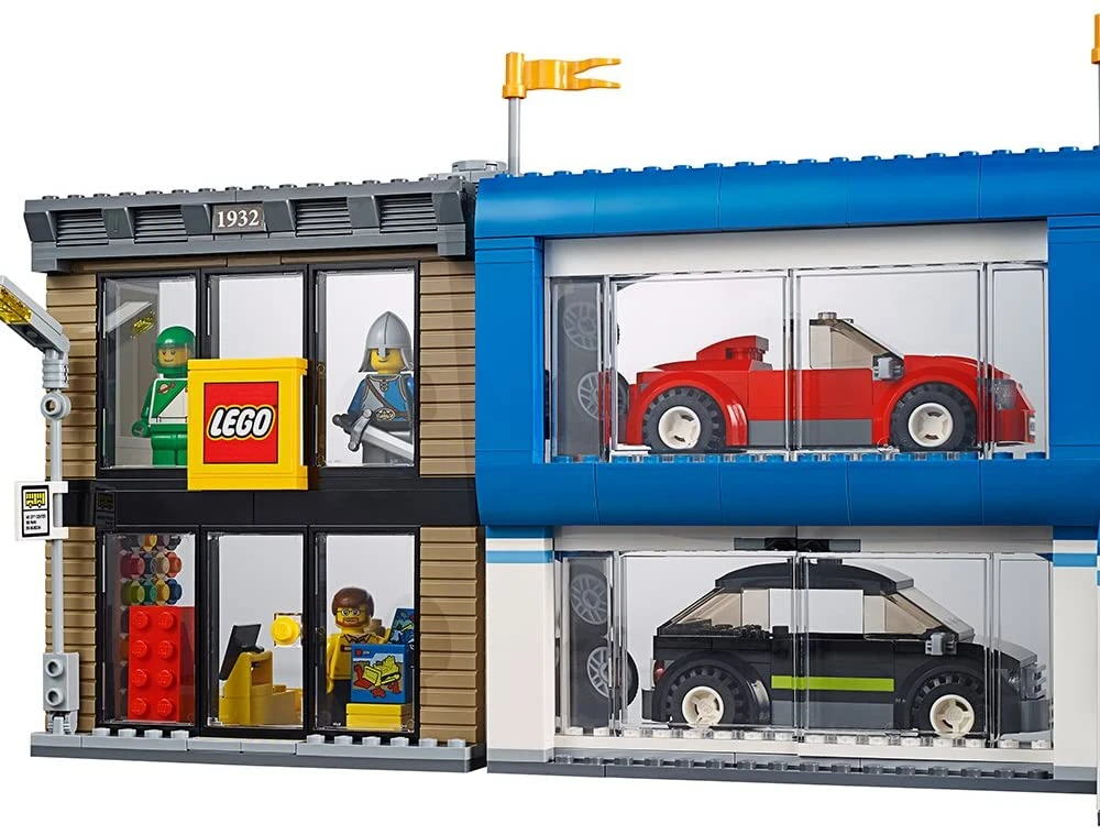 - Build your own City Square, complete with tram, LEGO Store, LEGO delivery truck, car dealership, three cars, tow truck, bike, pizza delivery scooter, tram stop, coffee shop, hot dog stand and news stand!