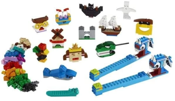 There are 12 LEGO toys to make – a castle, funny face, princess, bat, rooster, crook, pirate ship, owl, ghost, windmill, shark and a dinosaur – plus extra bricks for kids to build their own toys.