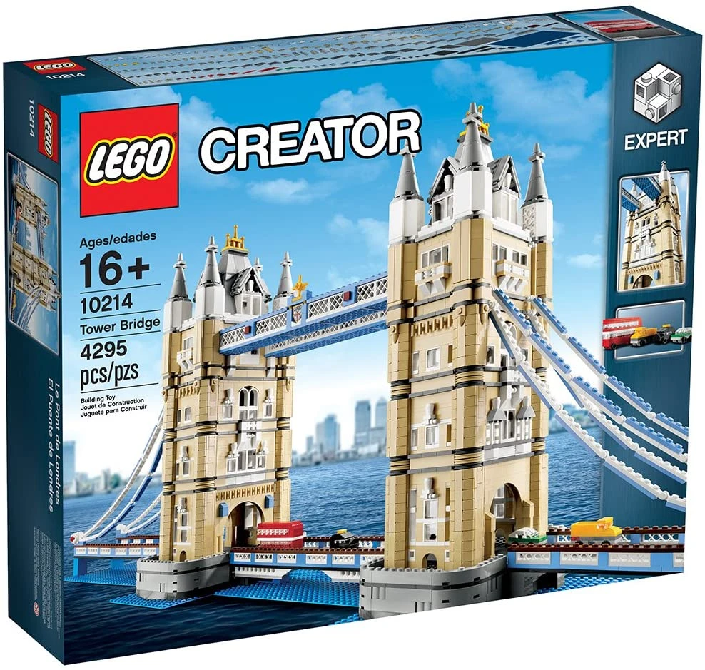 Stretching over the River Thames since 1894, the famous Tower Bridge of London, England is one of the most recognizable landmarks in the world. Now you can add this timeless classic to your LEGO world buildings collection! Designed with advanced building techniques and rare colors and elements, the Tower Bridge is complete with its iconic paired towers and a drawbridge that really opens. Fun to build and display, it locks together solidly but can be taken apart in sections for easy transport. Includes 4 miniature vehicles; a black London taxi, a traditional red double-decker bus, a yellow truck and a green automobile. Completed model measures 40″ (102 cm) long, 17″ (45 cm) high and 10″ (26 cm) wide.