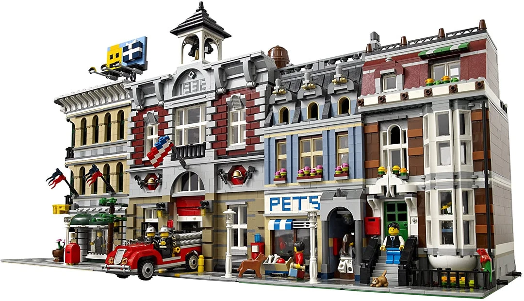 Continuing the LEGO Modular Buildings series, this highly detailed, 3-story Pet Shop building and townhouse with full internal and external detailing is the perfect addition to your LEGO town. Greet customers with a menagerie of pets and let them treat them with a selection of toys and supplies. The pet shop building features a hinged staircase for easy access, upper apartment with kitchenette and upper loft overlooking the open plan interior below. To the side, the tastefully appointed townhouse features a detailed ground floor with accessories and spiral staircase leading to the upper floor. The attic space features storage boxes and French doors leading out to an elegant front balcony, while the rooftop garden, complete with fresh vegetables, brightens up the rear of the building.