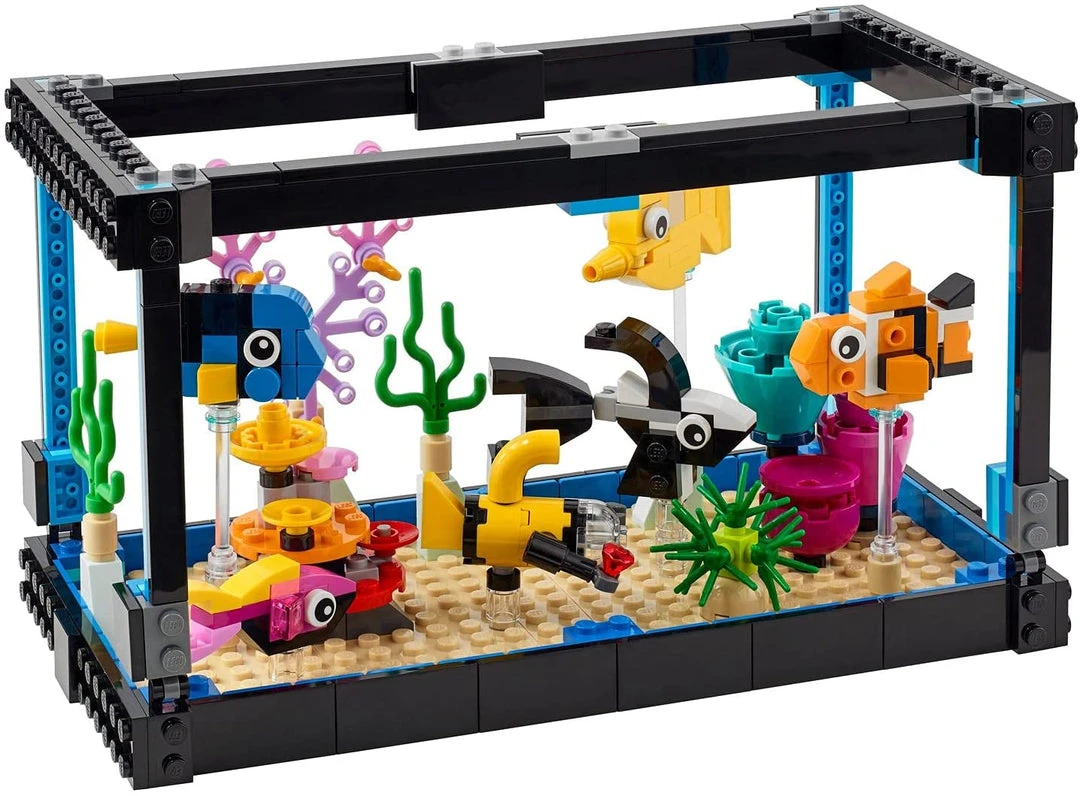 Kids can dive into their own underwater adventures with this LEGO® Creator 3in1 Fish Tank (31122) buildable toy. The glassless tank boasts 5 different vibrant fishes: a clown fish, a regal blue tang, a yellow tang, a cardinal fish and an anthias fish, as well as a mini submarine, some coral and an aquatic plant.