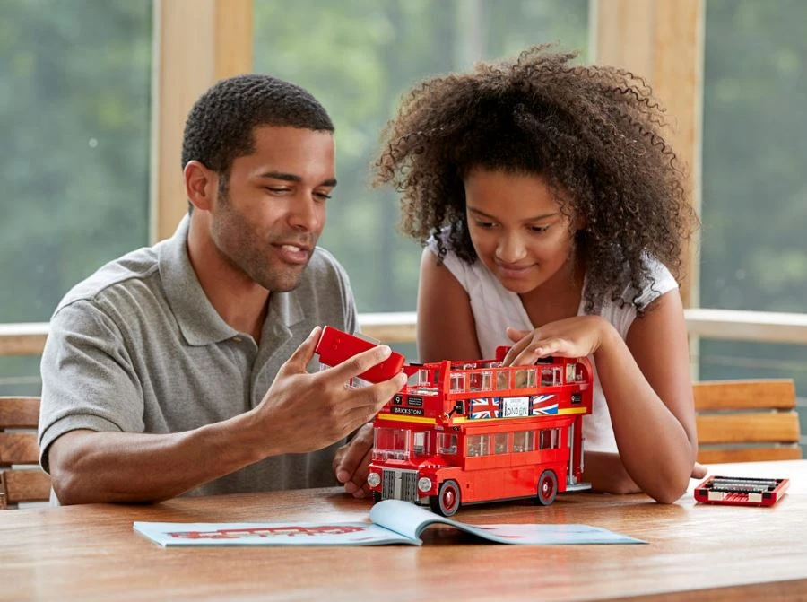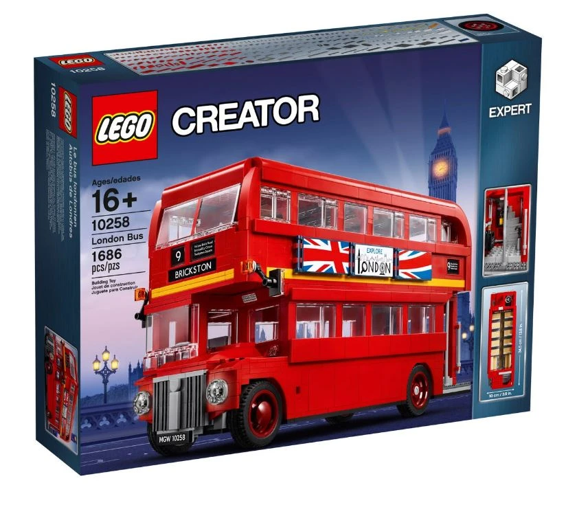 Celebrate iconic design with this charming double-decker London Bus, featuring a wealth of authentic details, including a bright-red color scheme, panoramic windshield, specially made standard-tread tires, destination sign, and an open rear boarding deck with a hand pole, ticket bin, fire extinguisher and a half-spiral staircase that leads to the upper sightseeing deck. Functions include an opening hood with engine, detailed driver’s cab with a sliding door, and a removable roof and upper deck for access to the detailed interior with worn look seating and additional authentic details, including a forgotten umbrella, newspaper, empty beverage can and discarded chewing gum. Reversible transit advertising posters are also provided as printed labels with a 1950s or present-day London promotion. This LEGO® Creator Expert model has been designed to provide a challenging and rewarding building experience with a touch of nostalgia and charm.