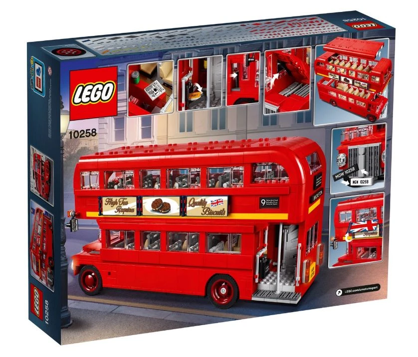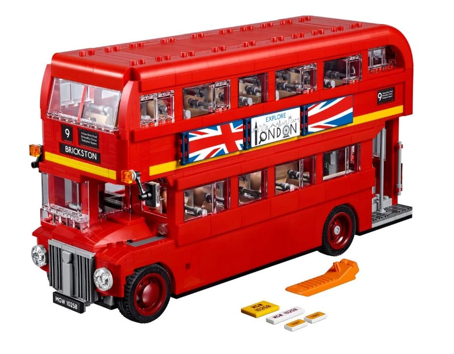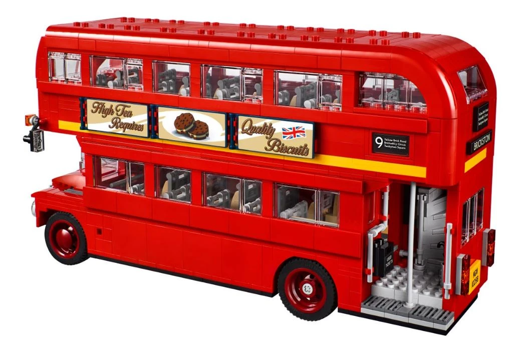 - The London Bus comes with an array of brick-built features and details, including large windows, bright red curved bodywork, panoramic windshield, reversible transit advertising posters provided as printed labels, specially made standard-tread tires and a destination sign. It also has an opening hood with engine, detailed driver’s cab with sliding door, and a removable roof and upper deck for access to the detailed interior.