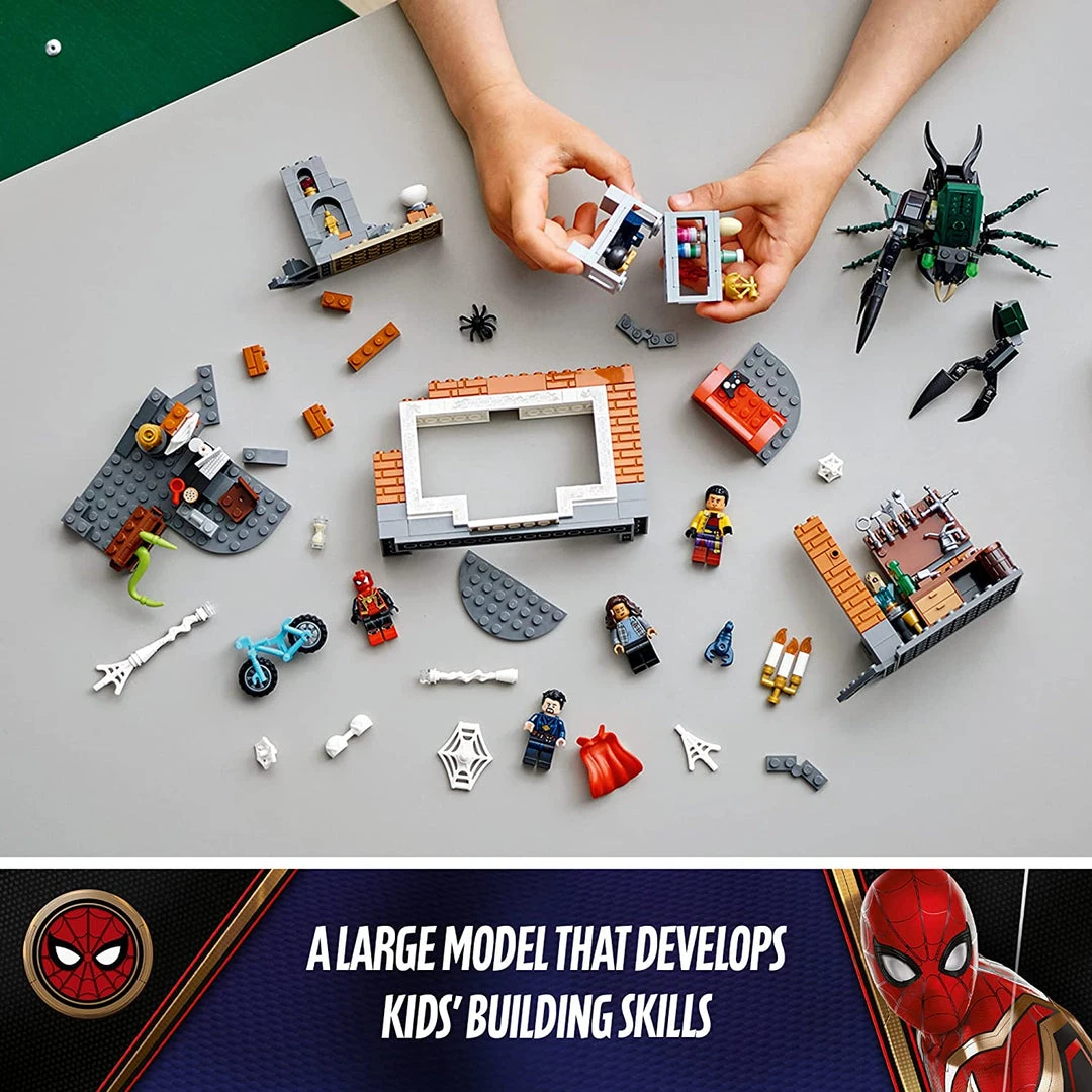 - Includes 4 minifigures: Spider-Man, MJ, Wong and Doctor Strange (with a fabric cloak).
