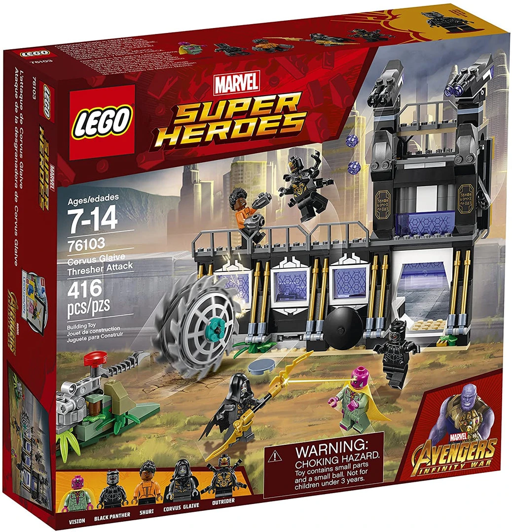 Stage an awesome battle at the Wakandan wall with Vision, Shuri and Black Panther against Corvus Glaive and an Outrider with this LEGO® Marvel Super Heroes 76103 Corvus Glaive Thresher Attack set. The wall features a lever-operated opening gate, tower with rotating, dual stud-shooting turrets, hidden disc shooter, Wakandan lab with flip function and the Infinity Stone element. The bad guys are attacking with a Thresher launcher—hit the right spot on the wall with the Thresher to activate the lab’s flip function. This super hero toy also includes 5 minifigures.