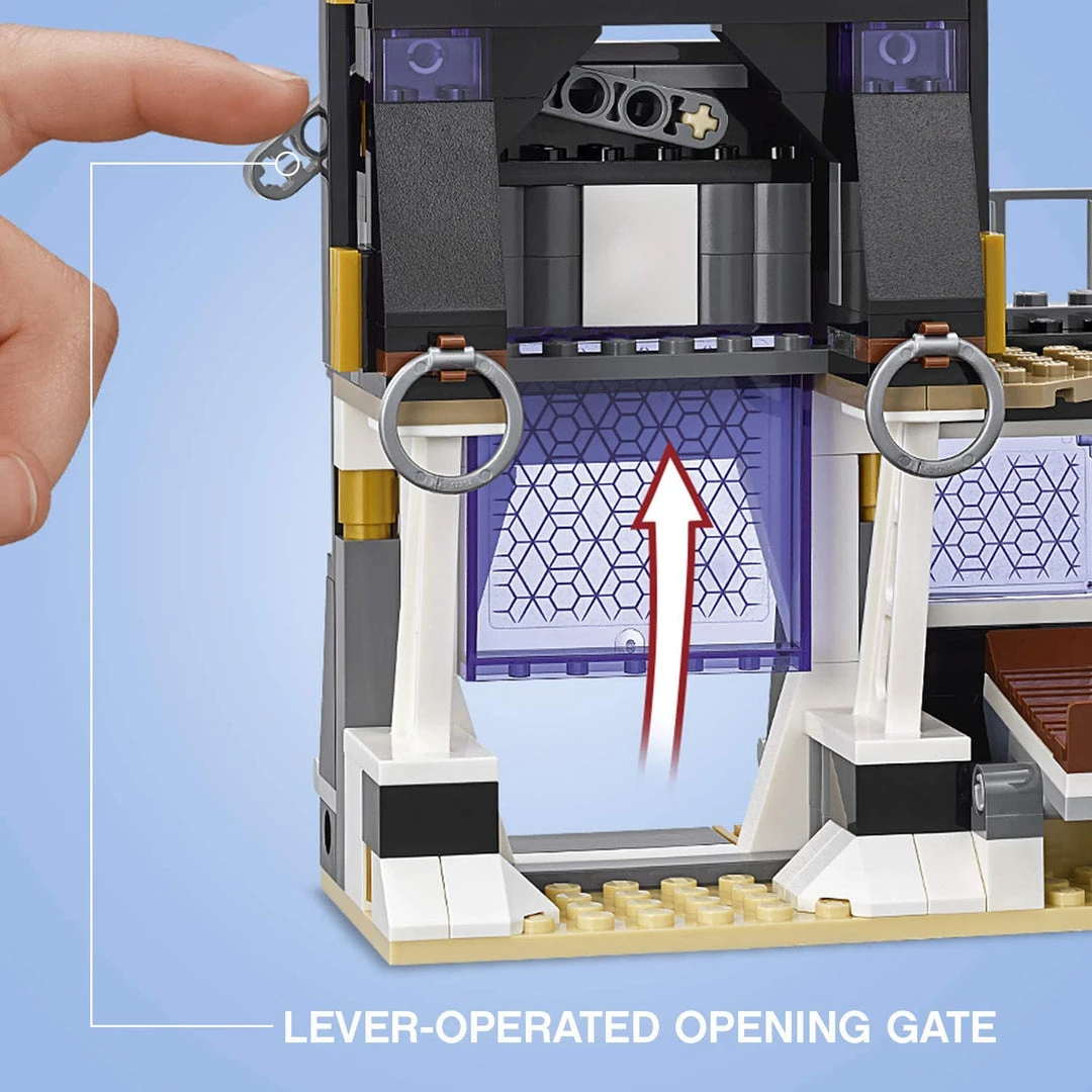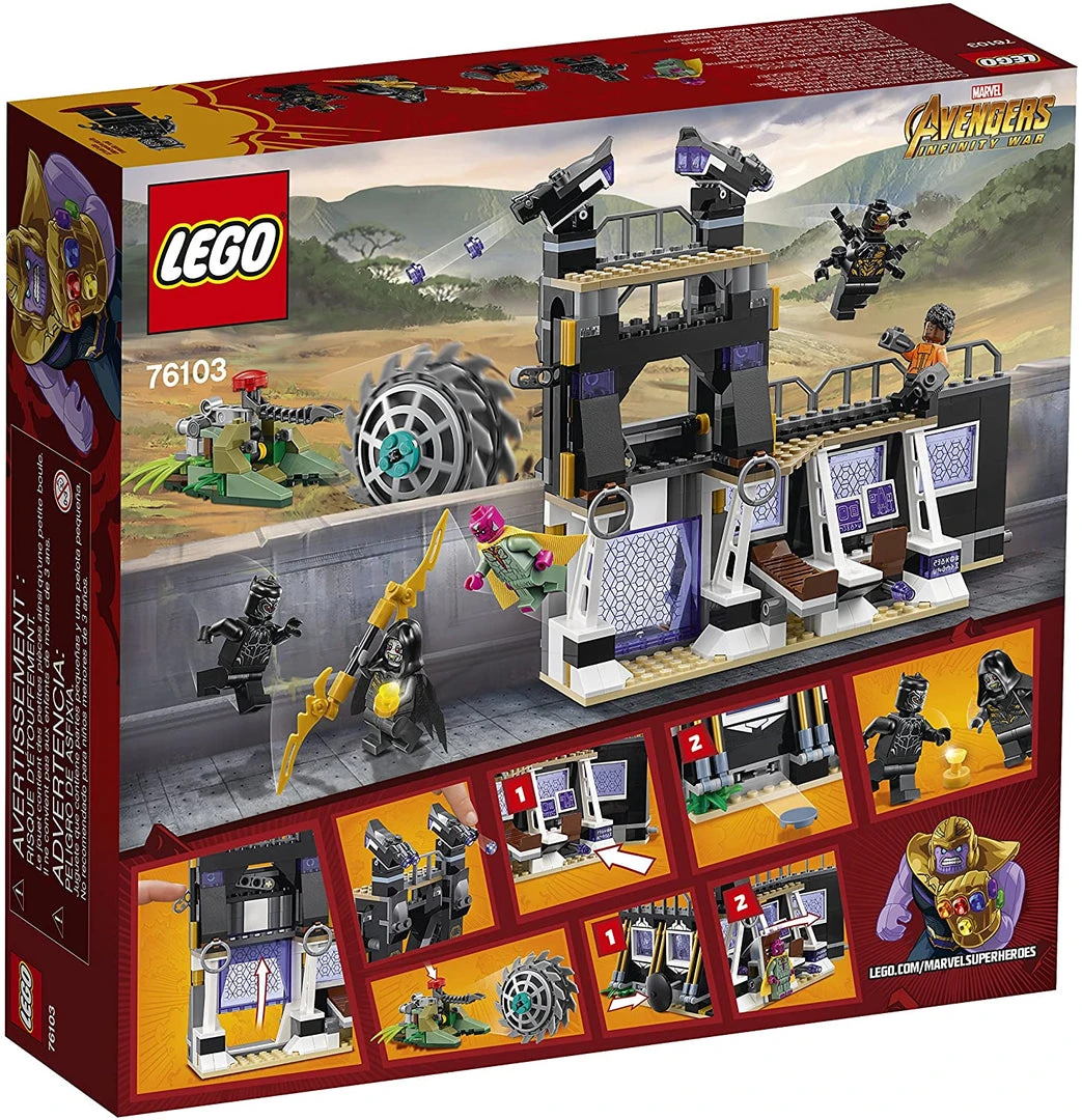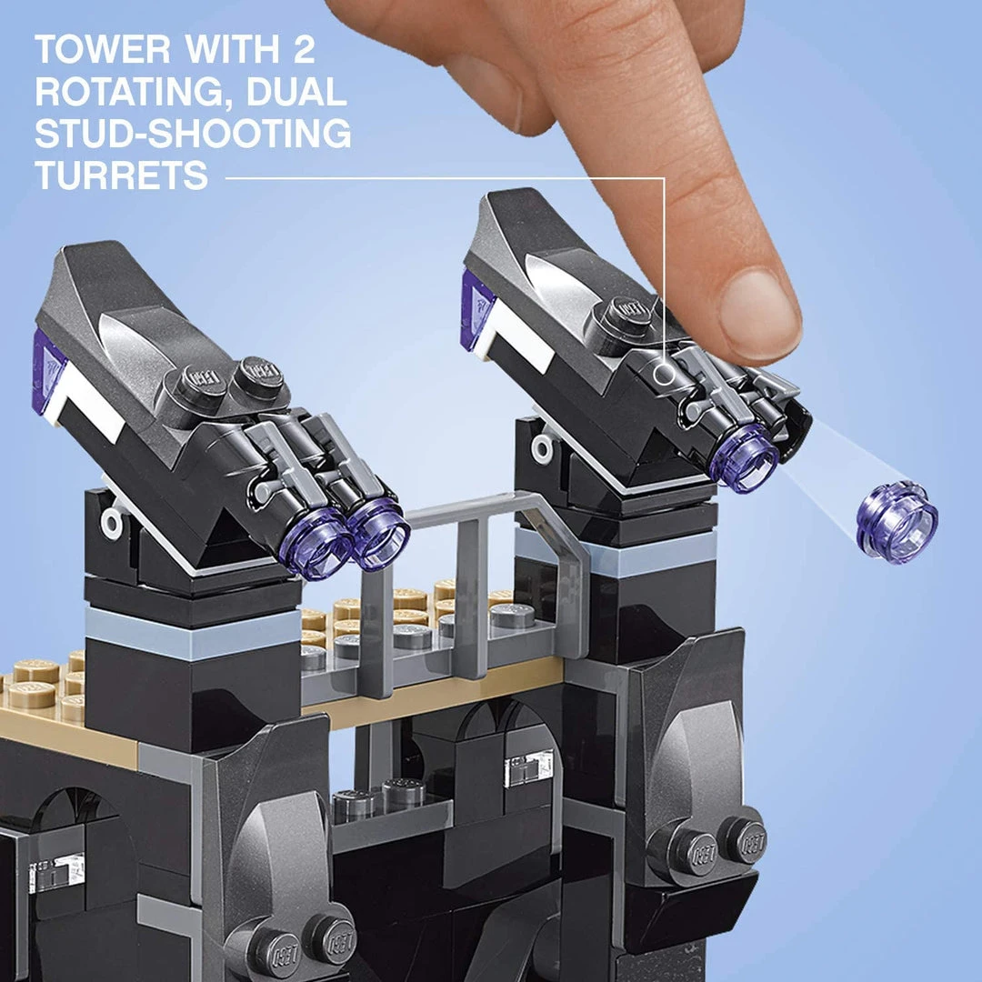 - Wakandan wall features a lever-operated opening gate, tower with 2 rotating, dual stud-shooting turrets, hidden disc shooter, hinged wall section, Wakandan lab with minifigure seat, desk and 2 computer screen elements, flip function and the Infinity Stone element.