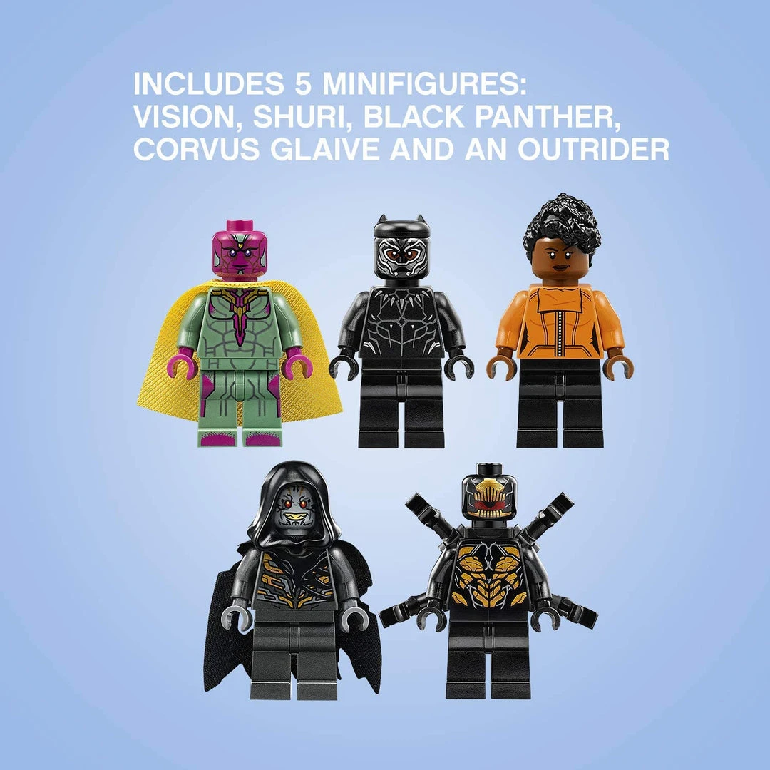 - Includes 5 minifigures: Vision, Shuri, Black Panther, Corvus Glaive and an Outrider.