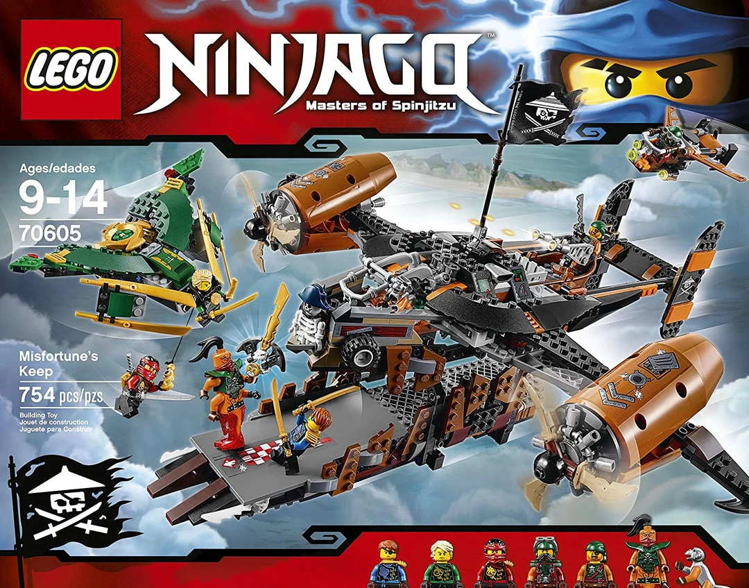 - The pirate’s airship/headquarters Misfortune’s Keep features an opening minifigure cockpit, lever-operated rotating engines with turning Ninja-blade propellers for launch and flight modes, 2 hidden fold-out cannons, 2 disc shooters, rotating aircraft gun, a detachable escape boat, armor crate and a sky pirates flag.