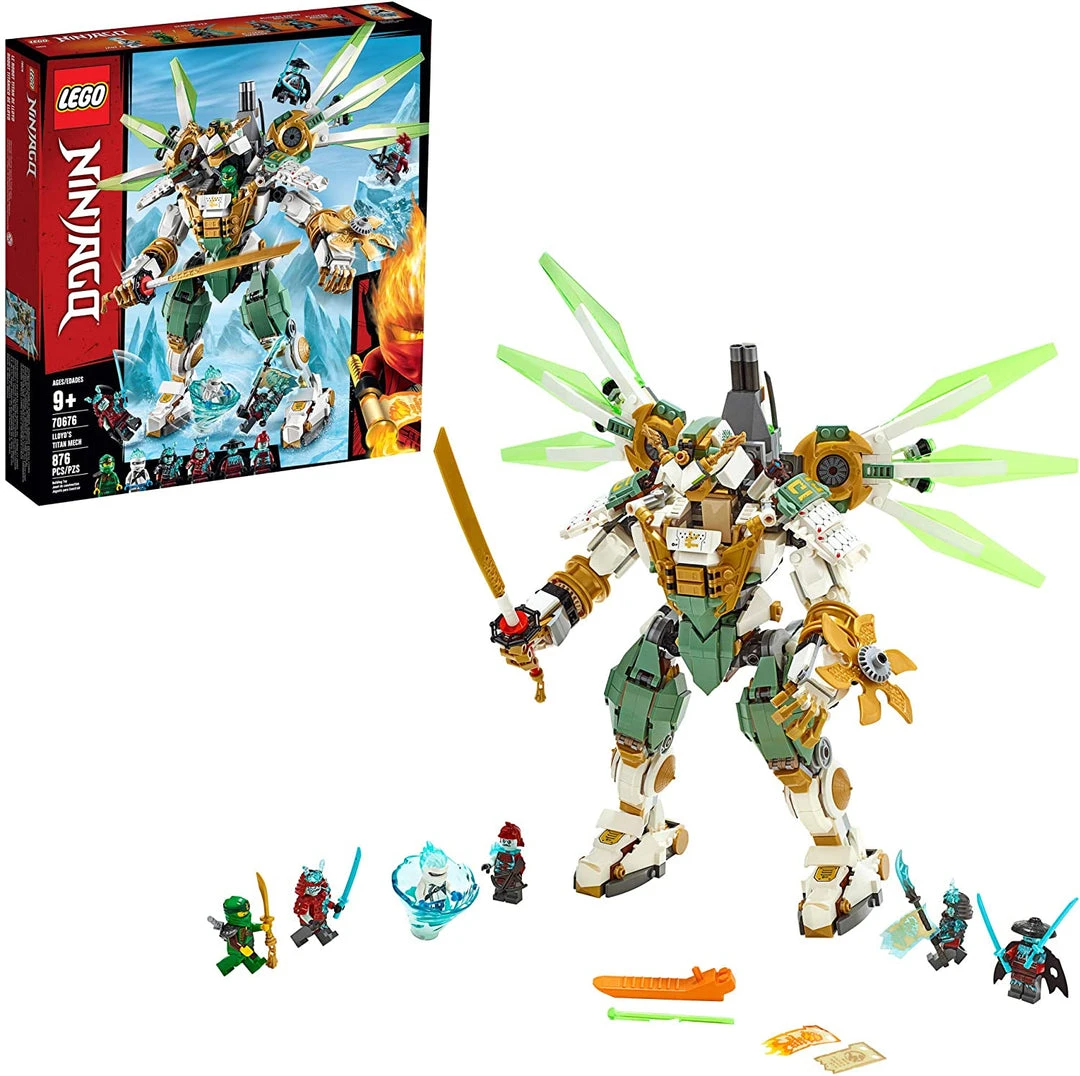 - Lloyd’s Titan Mech features a minifigure cockpit, posable arms and legs, gripping hands, spinning shuriken slicer/shield, giant katana and a detachable flyer with minifigure driver’s seat, adjustable wings and 2 spring-loaded shooters.