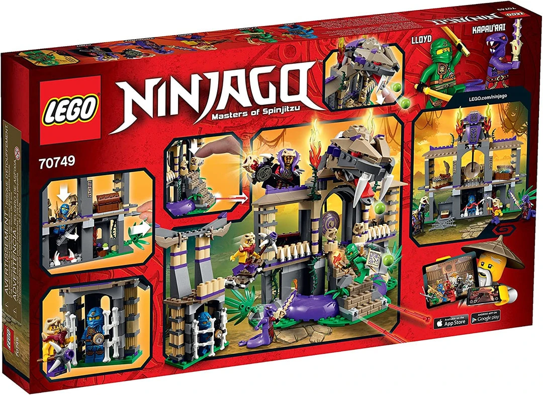 Deep in the jungle, Jay is being held captive by the Anacondrai. Find your way to their temple with Lloyd’s map. Once you get there, beware – Kapau’rai is on guard with his Anacondrai Blade, and Zugu is armed with a crossbow. Do you dare to Enter the Serpent? There are traps everywhere, including hidden spring-loaded shooters in the stairs, poison balls dropping from the snake’s mouth and a trapdoor! Search the caves for a second map with directions through the Anacondrai Temple. Find your way across the suspension bridge to the prison tower and free Jay! Includes 5 minifigures with assorted weapons and accessories: Lloyd, Jay, Chen, Kapau’rai and Zugu.