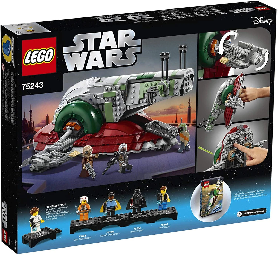 Celebrate the 20th anniversary of LEGO® Star Wars™ playsets with this detailed reinterpretation of Boba Fett’s classic Slave I. This iconic 75243 LEGO Star Wars starship is the most detailed version to date with features such as a self-leveling cockpit seat and side wings, a carry handle for easy transport and trigger-fired spring-loaded shooters. This amazing LEGO Star Wars collectible construction toy also includes a closing rear hatch to store the Han Solo in Carbonite element and 4 LEGO Star Wars minifigures, plus a bonus Princess Leia minifigure and display stand with 20th anniversary logo to mark this momentous milestone in the history of LEGO Star Wars sets.