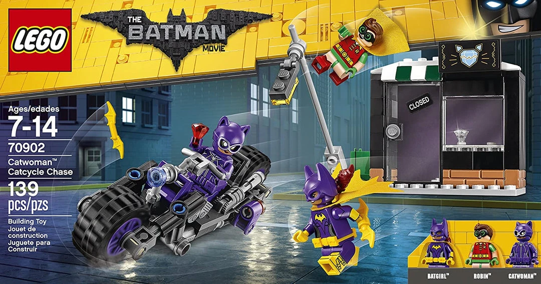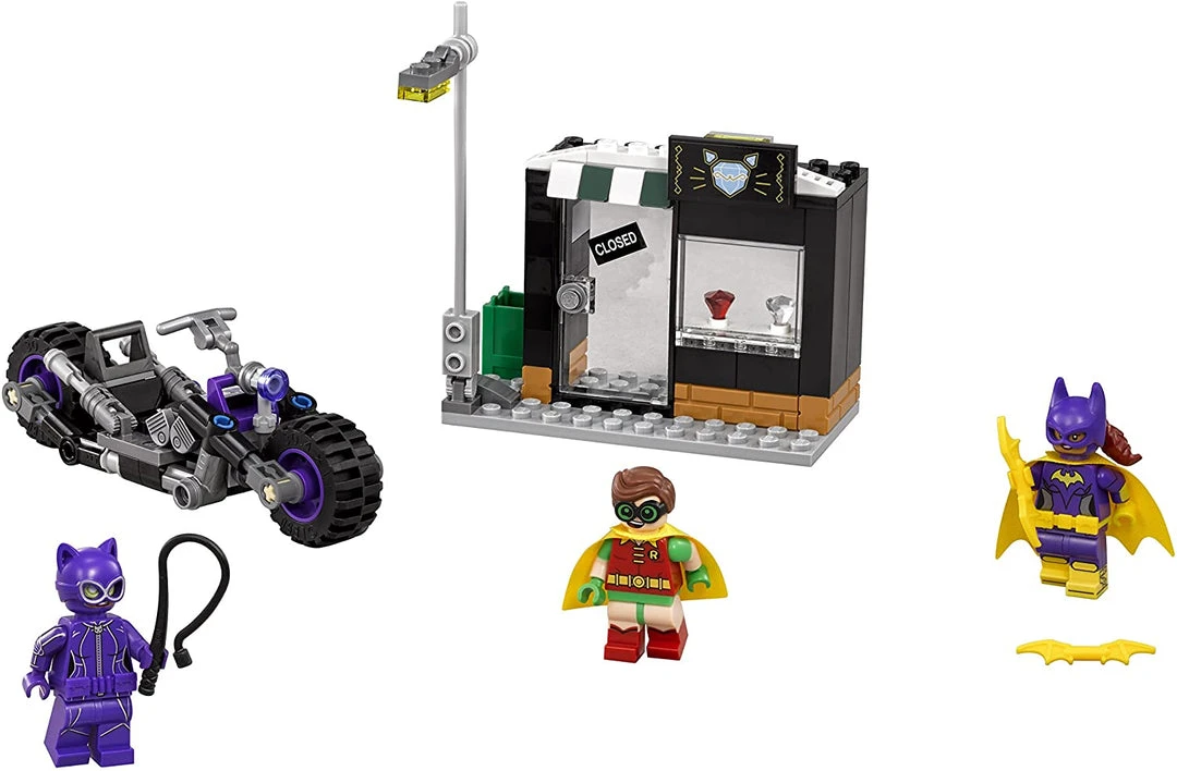 Help Batgirl™ and Robin™ thwart a jewel heist in THE LEGO® BATMAN MOVIE: Catwoman™ Catcycle Chase set, including the Catcycle and a buildable street scene with a jewelry store. Play-starting features include a lamppost with tipping function to knock over during the getaway pursuit, translucent diamond-style elements, plus Catwoman’s whip and Batgirl’s Batarangs. Includes three minifigures.