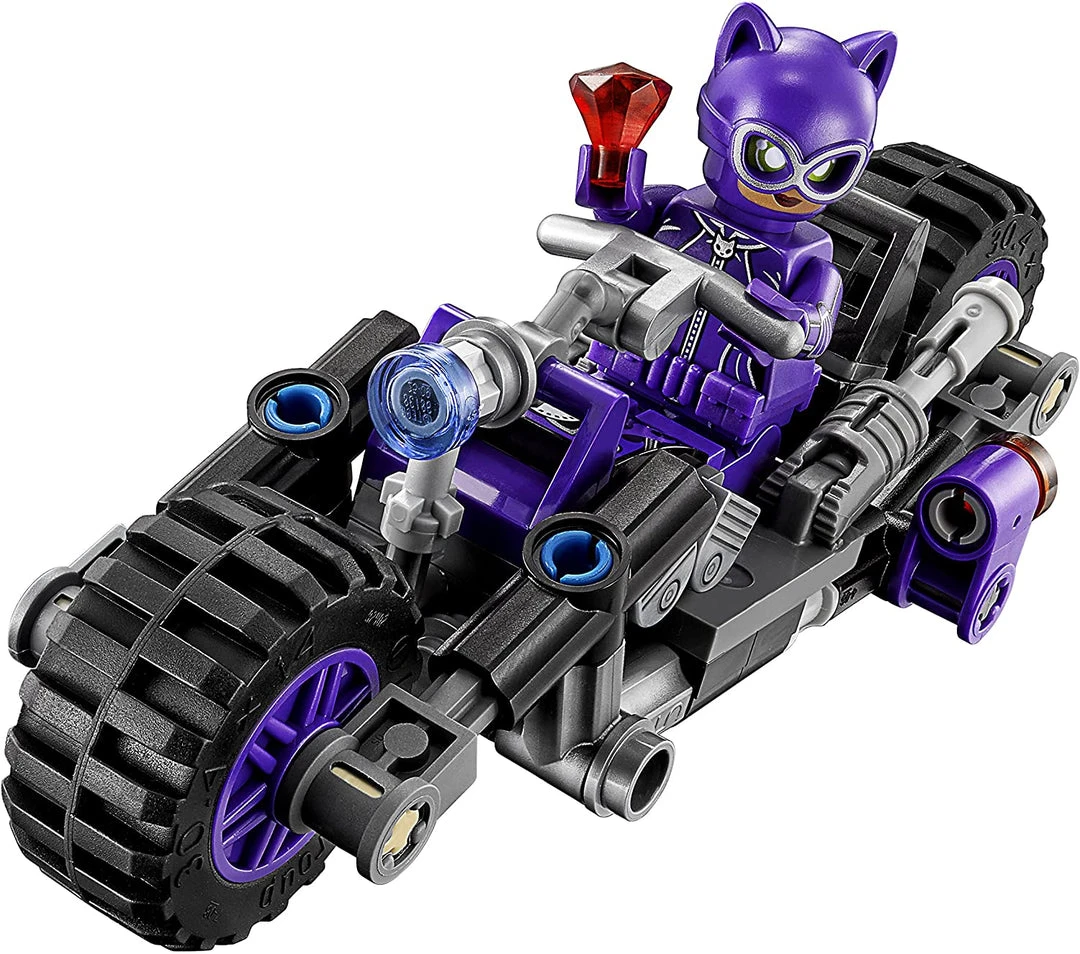 - The Catwoman™ Catcycle features a minifigure seat, printed dashboard, big wheels with rubber tires, engine elements and a translucent headlight-style element.