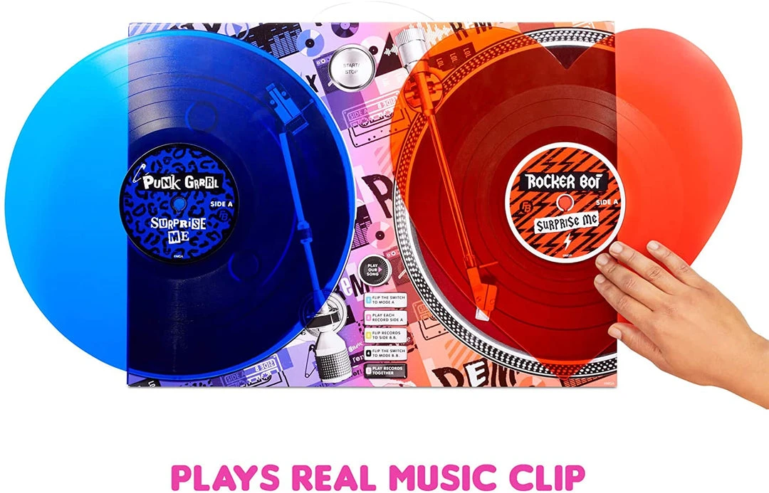 - SPIN RECORDS TO PLAY MUSIC: Includes 2 full-size records that you can spin to really play music on the package. Play each record on its own, then flip them over to Side BB (and flip the switch) to play their rockin’ duet.