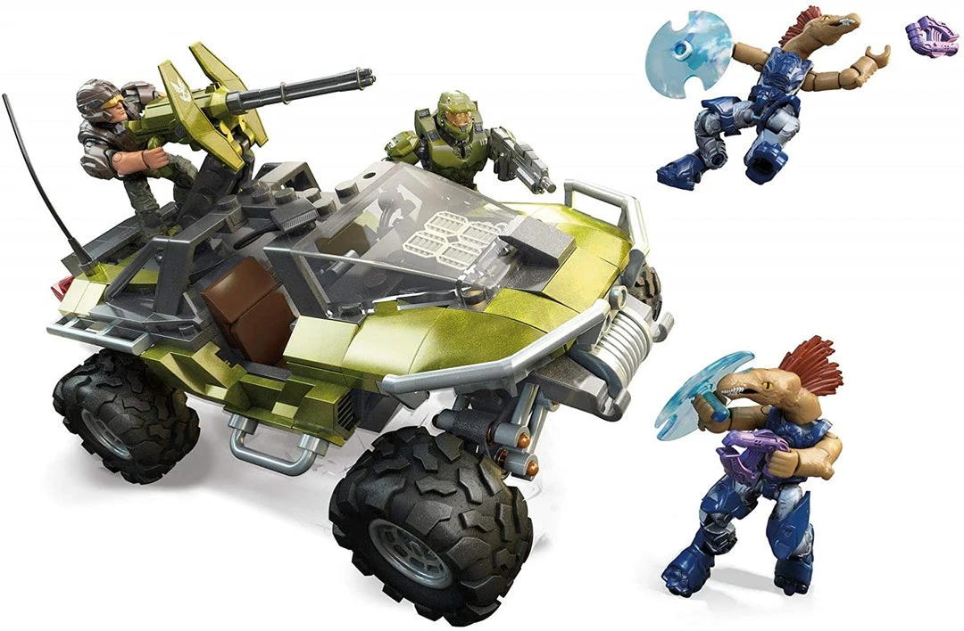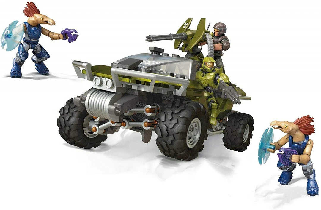 - Halo Infinite inspired UNSC Warthog vehicle building set with rolling wheels, cockpit, pivoting turret and working wheelbase suspension