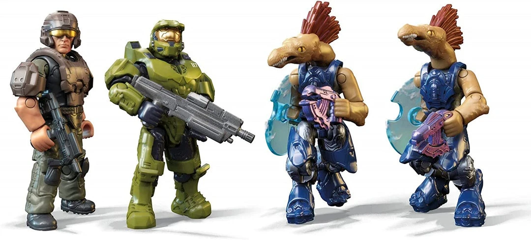 - 4 highly collectible micro action figures, Master Chief, UNSC Marine and 2 Jackal Freebooters, with authentic detail, 12 points of articulation, display stands and interchangeable weapon accessories