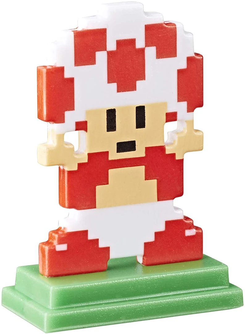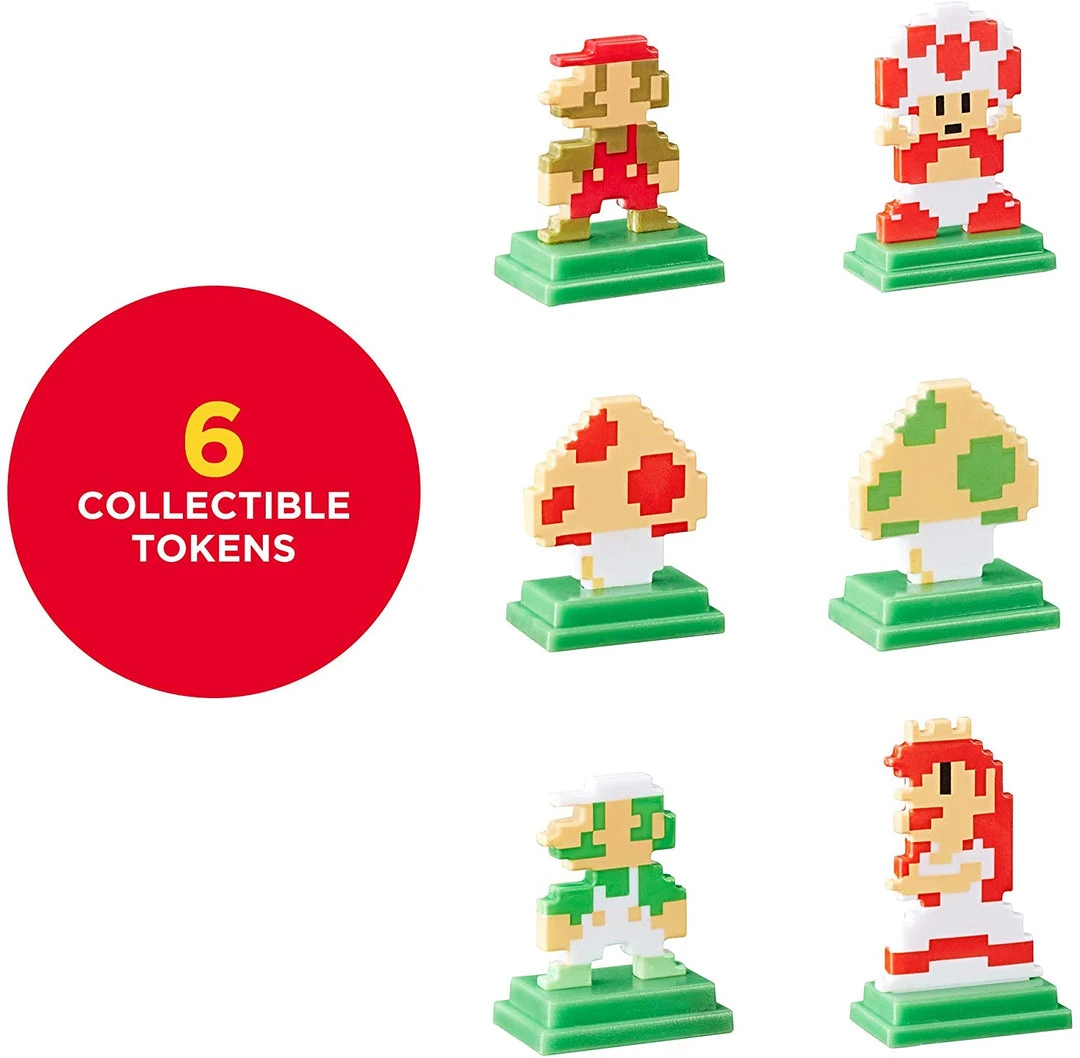 - 6 custom 9-bit styled tokens include: Mario, Luigi, Princess Peach, Toad, Super mushroom & 1-up mushroom